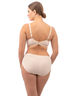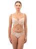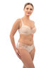 Бюстгальтер с формованными чашками, на стане, на каркасах. Гладкие чашки по верхнему краю украшены ажурной вышивкой. Центральная и боковые детали стана усилены монокапроном, в боковых швах – упругие пластины. Ажурные регулируемые бретели. Декор – атласный бант.