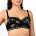 Оригинальный бюстгальтер классической формы на косточках с поролоновыми чашками. Выполнен из тонкой эластичной ткани, внутренняя часть чашек выполнена из мягкого хлопкового материала. Несъемные эластичные бретели регулируются по длине. Застегивается на два крючка в три позиции. Декорирован оригинальной вышивкой и кружевными вставками.