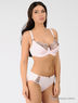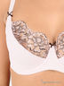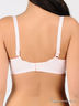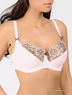 Оригинальный бюстгальтер классической формы на косточках с поролоновой чашкой. Выполнен из тонкой эластичной ткани. Несъемные эластичные бретели регулируются по длине. Застегивается на два крючка в три позиции. Чашки декорированы кружевными вставками с силиконовой лентой.