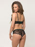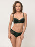 Модель бюстгальтера из нежного оригинального кружева черного цвета и тонкого сатина благородного темно-зеленого оттенка. Заложенные складки из сатина оригинально обрамляют чашку. Деталь из сатина по низу пояса придает дополнительный комфорт и поддержку.