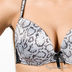 Притягательный бюстгальтер на каркасах выполнен из атласного сатина с принтом "питон". Формованные чашечки со съемными вкладышами декорированы атласным бантиком и имеют хлопковую подкладку. Боковые косточки обеспечивают дополнительную коррекцию. Боковинки украшены изящным кружевом. Бретели регулируются по длине. Застежка на два крючка. Петли расположены в три ряда.
