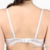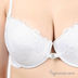 Застёжка спереди, украшена тремя стразиками. Бретели и чашки бюстгальтера из блестящей белой ткани с люрексом.