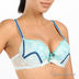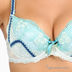 Бюстгальтер из микросетки нежно-голубого цвета, украшен тесьмой и кружевом цвета слоновой кости.