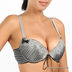 Чашка плотная (поролон 2мм) формованная на косточках, продублирована хлопком, со вставляющимися подушечками (поролон 3мм). Шнуровка между чашек подчеркивает форму груди. Одна чашка украшена бантиком.
