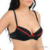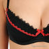 Бюстгальтер из эластичного шёлкового полотна мирового лидера BOSELLI & C. SPA (Италия) с лёгким рисунком в горошек. Чашечки со съемным Push-up формованные на косточках. Верхняя часть чашечек украшена кружевом и тонкими вставками контрастного красного цвета. Декоративные красные бантики у основания бретель с плетеным узором и между чашечек. Бретели регулируются.