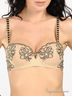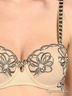 Бюстгальтер на косточках. Бесшовные формованные чашечки. Бретели регулируются по длине, отстегиваются. Застежка на два крючка в 3 ряда. Украшен кружевом и вышивкой.