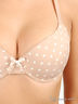 Оригинальный бюстгальтер классической формы с поролоновыми чашками на косточках. Выполнен из шелковистой эластичной ткани с рисунком - горох. Несъемные бретели регулируются по длине. Застегивается на два крючка в три позиции.