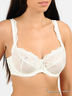 Оригинальный бюстгальтер классической формы с чашками на косточках. Чашки выполнены из тонкого кружева с подкладкой, спинка из шелковистой эластичной ткани. Несъемные бретели регулируются по длине. Застегивается на два крючка в три позиции. Декорирован шнуровкой по бокам.