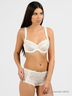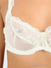 Оригинальный бюстгальтер классической формы с чашками на косточках. Чашки выполнены из тонкого кружева с подкладкой, спинка из шелковистой эластичной ткани. Несъемные бретели регулируются по длине. Застегивается на два крючка в три позиции. Декорирован шнуровкой по бокам.