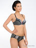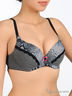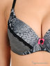 Бюстгальтер классической формы на косточках с поролоновыми чашками. Выполнен из эластичного трикотажа, чашки внутри с хлопковой подкладкой. Несъемные эластичные бретели регулируются по длине. Застегивается на два крючка в три позиции. Декорирован оригинальными вставками с принтом.