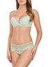 Бюстгальтер на каркасной поддержке с формованной чашкой и встроенным "пуш-ап". Легкая драпировка. Веерное расположение эластичного кружева у основания чашки. Декор - сатиновый бантик.