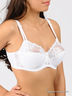 Оригинальный бюстгальтер классической формы на косточках. Чашки выполнены из кружева с хлопковой подкладкой, спинка из тонкой эластичной ткани. Нижняя часть чашек на поролоне. Несъемные эластичные бретели регулируются по длине. Застегивается на два крючка в три позиции.
