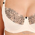 Оригинальный бюстгальтер на косточках с поролоновыми чашками. Выполнен из тонкой эластичной ткани. Несъемные эластичные бретели регулируются по длине. Застегивается на два крючка в три позиции. Декорирован кружевными вставками.