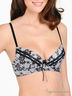 Оригинальный бюстгальтер - пуш-ап с плотными чашечками на косточках со съемным уплотнителем. Тонкие эластичные бретели регулируются по длине. Застежка на один крючок на две позиции. Декорирован блеском и бантиком с подвеской.