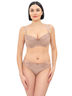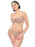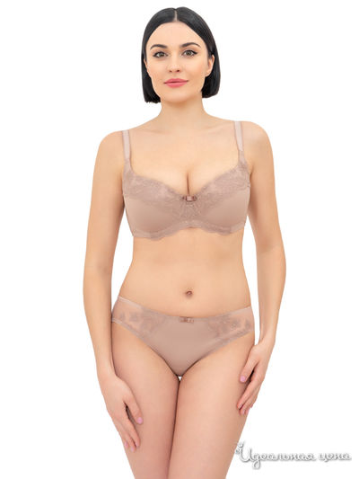 Бюстгальтер с формованными чашками, на стане, на каркасах. Гладкие чашки по верхнему краю украшены ажурной вышивкой. Центральная и боковые детали стана усилены монокапроном, в боковых швах – упругие пластины. Ажурные регулируемые бретели. Декор – атласный бант.