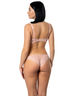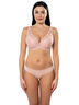 Бюстгальтер с формованными чашками из тонкого поролона на стане, на каркасах. Передняя и боковая деталь стана усилены монокапроном. Упругие пластины в боковых деталях. Верхняя кружевная деталь чашки переходит в бретель. Ажурные бретели «anti-slip». Два варианта крепления бретелей: классический и крест-накрест. Украшение – бантик.
