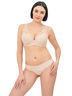 Бюстгальтер с формованными чашками из тонкого поролона на стане, на каркасах. Передняя и боковая деталь стана усилены монокапроном. Упругие пластины в боковых деталях. Верхняя кружевная деталь чашки переходит в бретель. Ажурные бретели «anti-slip». Два варианта крепления бретелей: классический и крест-накрест. Украшение – бантик.