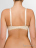 Нарядный классический бюстгальтер push-up из набивной ткани с цветочным орнаментом имеет съемные поролоновые вкладыши. Верх отделан кружевом бежевого цвета. Бока и спинка из кружева, бока усилены косточками. Бретели съемные узкие регулируются, сверху декорированы атласной тесьмой и бантиком. Застежка: 2 крючка на 3 позиции.