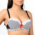 Оригинальный бюстгальтер Push up на косточках с поролоновыми чашками. Выполнен из тонкой эластичной ткани, внутренняя часть чашек выполнена из мягкого хлопкового материала. Несъемные эластичные бретели регулируются по длине. Нижняя часть чашек дополнена съемным уплотнителем. Застегивается на два крючка в три позиции. Декорирован оригинальным принтом и контрастным бантиком.