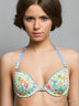 Оригинальный бюстгальтер Push up на косточках с поролоновыми чашками. Выполнен из тонкой эластичной ткани. Эластичная бретеля через шею регулируется по длине. Декорирован оригинальным принтом. Спереди дополнен застежкой.
