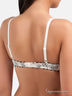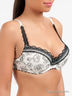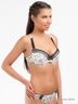 Великолепный бюстгальтер с тонкой поролоновой чашкой на косточках, дополненной съемными вкладками, создающими эффект push-up. Выполнен из тонкой эластичной ткани с рисунком, чашки с хлопковой подкладкой. Несъемные бретели регулируются по длине, застежка на один крючок в три позиции. Декорирован ажурными нашивками на чашках.