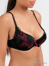 Отличный бюстгальтер с тонкой поролоновой чашкой на косточках, дополненной съемными вкладками, создающими эффект push-up. Выполнен из тонкой шелковистой эластичной ткани. Несъемные бретели регулируются по длине, застежка на один крючок в три позиции, чашки с хлопковой подкладкой. Бюстгальтер декорирован сетчатыми нашивками с контрастной вышивкой на чашках.
