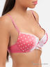 Очаровательный бюстгальтер с поролоновыми чашками на косточках, дополненными несъемным уплотнителем push-up. Выполнен из тонкой шелковистой эластичной ткани. Несъемные бретели регулируются по длине, застежка на два крючка в три позиции. Декорирован рисунком-горох и ажурными нашивками со шнуровкой.