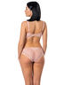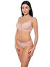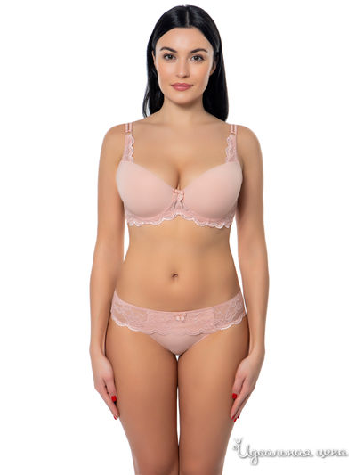 Бюстгальтер с гладкими формованными чашками, на стане, на каркасах. Центральная и боковые детали стана выполнены из кружева и усилены монокапроном. Упругие пластины в боковых деталях стана. Ажурные бретели «anti-slip» спереди, в местах крепления к чашкам, выполнены из кружева, усиленного монокапроном. Украшение – бантик.