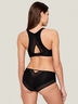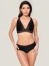 Чёрный бюстгальтер-топ с мягкой чашкой из жаккардового эластичного полотна и декоративной ленты. На спинке стильный треугольный вырез и застёжка. Удобный и элегантный вариант.