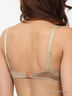Бюстгальтер push-up на косточках из блестящей бежевой ткани, с золотым отливом. Сверху на чашках отделка - накладной элемент из вышивки. Вставки push-up убираются. Спереди украшение бантик. По низу чашки слегка задрапированы. В боках дополнительные швы. Бретели регулируемые, съемные.