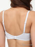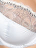 Высокий бюстгальтер из эластичной мерцающей ткани, нижняя половина чашки на тонком поролоне, верхняя часть из кружева в тон основной ткани. По бокам дополнительные "усы". Бретели регулируются, не убираются. Спереди декоративный элемент.