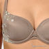 Бюстгальтер с закрытыми чашками, тонкий слой поролона, косточки. Регулируемые по длине бретели. Декор вышивкой и кружевом. Застежка на спине на три ряда двойных крючков. Подкладка из мягкой ткани.