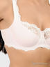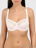 Великолепный бюстгальтер классической формы на косточках. Чашки до половины уплотнены тонким поролоном, верхнюю часть составляет эластичная кружевная вставка на резинке. Выполнен из тонкой эластичной ткани с жаккардовым плетением, чашки с хлопковой подкладкой. Несъемные бретели регулируются по длине, застежка на два крючка в две позиции.