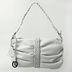 Стильная маленькая сумочка из жатой кожи на одинарном плетеном ремешке. Основное отделение закрывается на молнию и содержит карманы разного типа. Подкладка - бежевый хлопок, фурнитура - серебро.