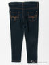 Облегающие джеггинсы выполнены из плотного трикотажа. Отрезной пояс с пришитыми шлевками. Застежка на пуговицу. Три передних кармана, два задних кармана.