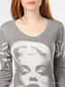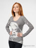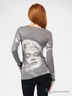 Трикотажный джемпер классического покроя выполнен из мягкого, нежного и приятного на ощупь материала жемчужно-серого цвета. Широкая круглая горловина. Длинные рукава. Декорирован стильным принтом.