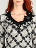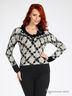 Стильный трикотажный джемпер приталенного кроя, с V-образным вырезом горловины и длинными рукавами. Изделие украшено стразами, нашивками, металлической несъемной брошью.