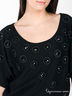 Свободный силуэт, зауженный к низу. Широкий короткий рукав кроя "летучая мышь". Глубокий округлый вырез горловины. Низ изделия прилегает по бедрам. Полочка расшита декоративными пуговицами.