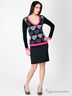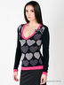 Прилегающий по фигуре силуэт. Глубокий фигурный вырез горловины. Полочка выполнена из ткани с принтом в виде сердечек. Розовая окантовка выреза горловины, низа изделия и манжет рукавов. Дополнение в виде декоративной броши-банта.