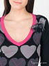 Прилегающий по фигуре силуэт. Глубокий фигурный вырез горловины. Полочка выполнена из ткани с принтом в виде сердечек. Розовая окантовка выреза горловины, низа изделия и манжет рукавов. Дополнение в виде декоративной броши-банта.