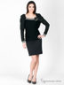 Полуприлегающий силуэт. Длинный рукав расцветкой в горошек скроен в виде фонарика. Вырез горловины - каре. Спинка и полочка выполнены продольной плотной вязкой из нитей черного цвета. Декоративная брошь у выреза горловины.