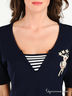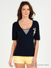 Детали: короткий прямой рукав, полочка декорирован вставкой в полоску и вышивкой со стразами