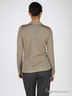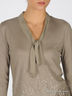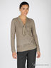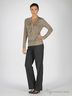 Джемпер из тонкого трикотажа. Длинные рукава. V- образный вырез. Контур ворота, рукавов и низ изделия отделаны шелковой тканью. Спереди изделие декорировано пайетками.