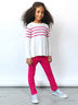 Очень мягкая кофта с округлым вырезом и длинными рукавами. Изделие декорировано контрастным, модным рисунком «в полоску» с люрексом. На рукаве фирменный принт Appaman.