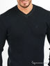 Стильный джемпер из тонкой, эластичной ткани, приятной на ощупь. Прямого кроя. V-образный вырез горловины дополнен резинкой в мелкий рубчик. Длинный прямой рукав и низ изделия на резинке в рубчик.