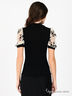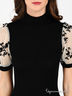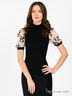 Детали: ворот-стойка, короткий сетчатый рукав-фонарик на трикотажной манжете, низ изделия обработан оверлоком