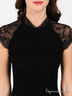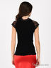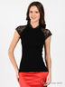 Детали: ворот-стойка и короткий рукав-реглан выполнены из кружевной гипюровой ткани, низ изделия обработан оверлоком