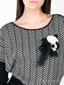 Свободный крой, зауженный к низу. Цельнокройный длинный рукав "летучая мышь". Высокая манжета рукава выполнена в виде эластичной резинки. Плечевые швы офрмлены декоративной прорезью. Широкий округлый вырез горловины. Низ джемпера "посажен" на широкую манжету-резинку. Декоративная брошь на груди.