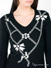 Прилегающий силуэт. Длинный рукав. V-образный вырез горловины. Вставки в виде полос светлой ткани на манжетах рукавов и по нищу изделия. На полочке принт в виде бантиков, расшитый стразами.