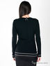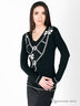 Прилегающий силуэт. Длинный рукав. V-образный вырез горловины. Вставки в виде полос светлой ткани на манжетах рукавов и по нищу изделия. На полочке принт в виде бантиков, расшитый стразами.